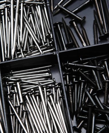 Nails come in a variety of sizes and types, from small, barrel headed finishing nails to common nails and spiral nails designed to grip wood fibers (the latter being harder to remove than the rest). Sizes are gauged by the length of their shaft and diameter of their head. A good rule of thumb if one is determined to use nails is to only use stainless steel, as it will resist rust the longest and hence give you a deck with greater longevity. Nails are cheap, easy to use, and will absolutely get the job done.